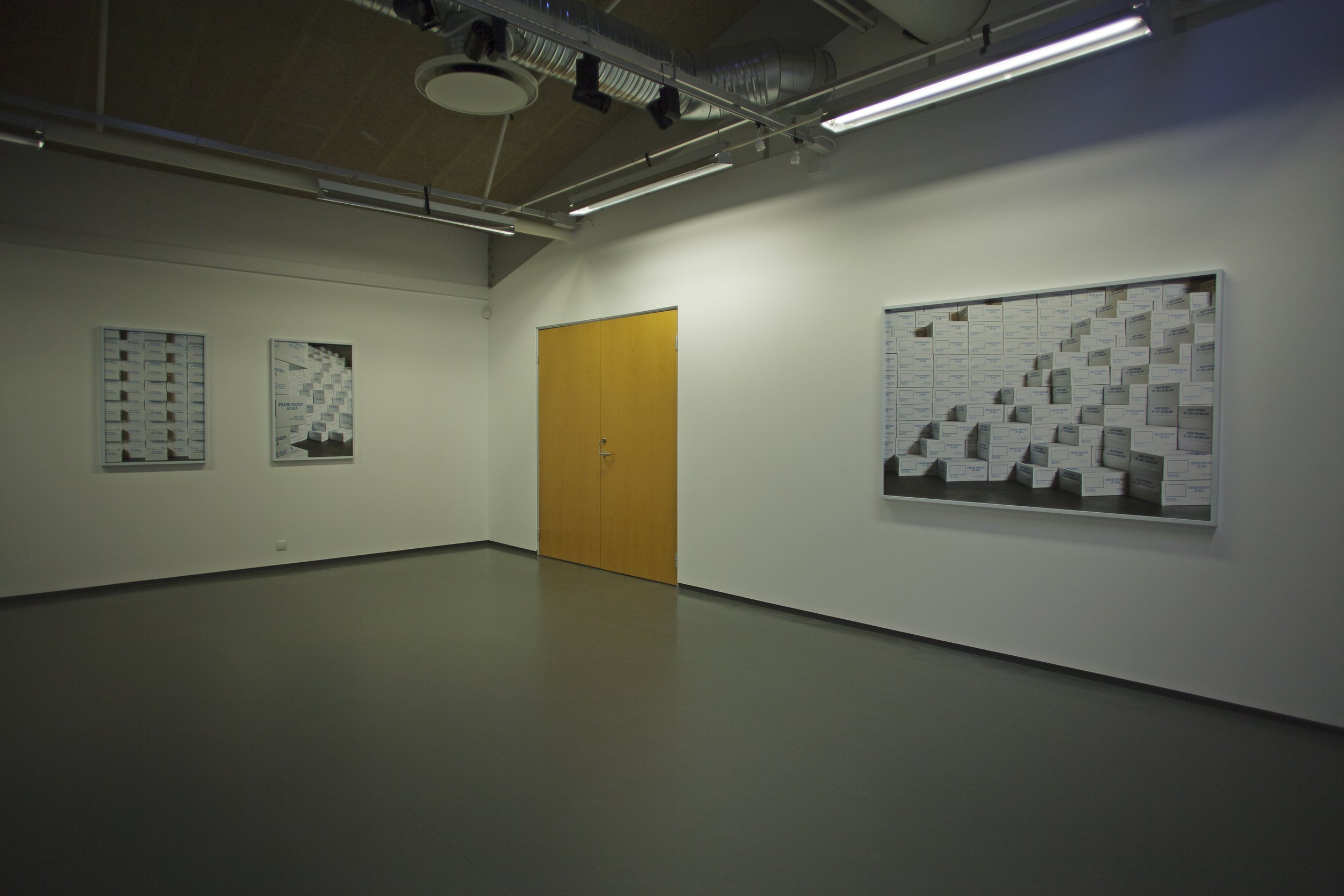 Through the photographic documentation of this project, new autonomous artworks have emerged, which now stand on their own terms. The square white boxes with blue text reading Keep Frozen at –20°C or Below have been stacked according to the artist’s compositional logic, resembling immutable sculptures and forming a striking visual field in which light and shadow generate a strong sense of depth and rhythm.