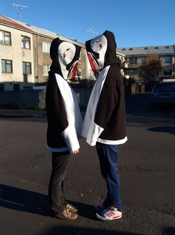 The hoodies were originally made as part of the mixed-media installation Don´t feed them after midnight. The cult of the cute puffin gremlin in 2006 and were thought as performance outfits taking the installation to the streets. The buyers thus become a part of the mechanism of the art work.