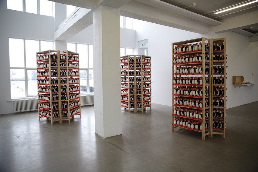 Another sculpture is Thinking Like a Mountain. Thinking Like a Mall (2019) comprised of 450 puffin teddies lying in a heap on a wooden table next to Puffin Shop. The second half of the work’s title is borrowed from the book Thinking Like a Mall: Environmental Philosophy after the End of Nature (2016) written by Steven Vogel, who argues provocatively that environmental philosophy, in its ethics, should no longer draw a distinction between the natural and the artificial. By directly confronting puffin imagery as a mass-produced tourist keepsake and tangible symbol of contemporary Icelandic cultural identity, the sculptures delved deeper into issues surrounding the commodification of ethnic and cultural identities associated with the massive growth of the tourism industry in Iceland and beyond.