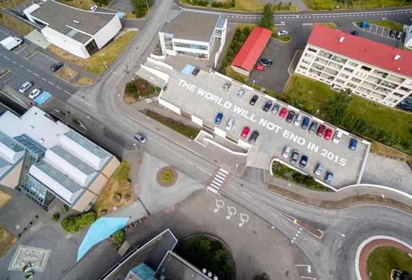 The world will not end in 2015 is a commissioned work in public space. The artist works with the idea of fear propaganda in our society. In a humorous way she reflects on the Maya prophecy of apocalypse in 2012 with a multilayered message to individuals as well as the society altogether. The sound part of the work gives it another perspective as The New World Symphony by Antonin Dvorák is broadcasted over the public parking space in Kopavogur. The Symphony was written as an ode to The New World as refugees from Europe where immigrating to the US during WWII. The words and the music together become a reminder of how our world is endlessly changing, of how each ending is a new beginning.